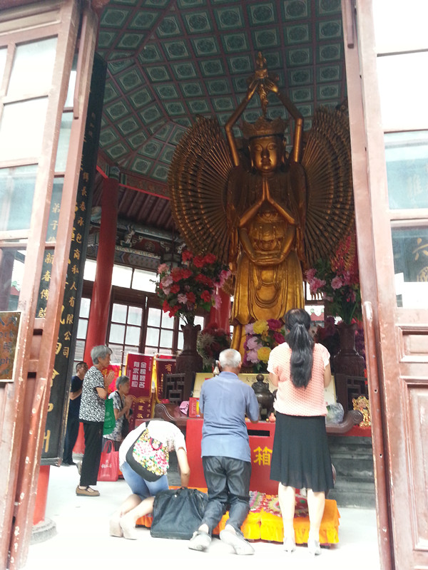 第三天,我們來(lái)到了中華民族歷史發(fā)源地、中國(guó)文化搖籃的黃河南岸,一座歷史文化悠久的古城--汴梁開(kāi)封。我們先行來(lái)到的是開(kāi)封市中心的大相國(guó)寺。大相國(guó)寺是中國(guó)著名的佛教寺院,被稱為中原四大名寺。這里最震撼的便是清朝一無(wú)名氏花費(fèi)50多年雕刻出的千手千眼佛。